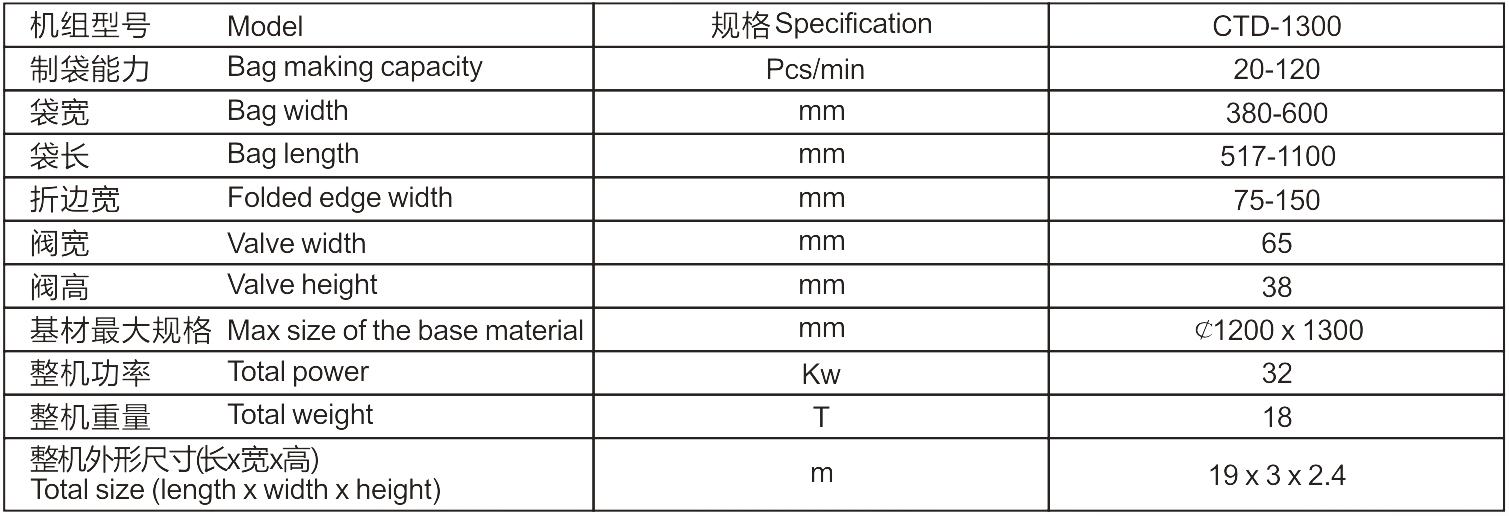 本機組是以單面涂膜的二合一涂塑復合編織布或三合一紙塑復合編織布及紙袋紙作為基材,通過多色柔版印刷,打孔后進行折邊成筒,并由塑料擠出粘邊而成圓狀袋體,再連續(xù)切割,計數(shù)疊袋的專用設(shè)備。